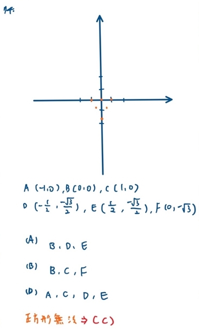 74. 已知座標平面有六個點(−1,0), (0,0), (1,0),,則選取一些點當頂點,無法形成何種圖形? (A)正三角形 (B)直角三角形 (C)正方形 (D)等腰梯形
