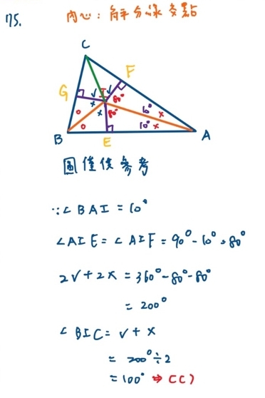 75. 已知∆ABC 中 I 為內心且∠BAI=10°,則∠BIC=?