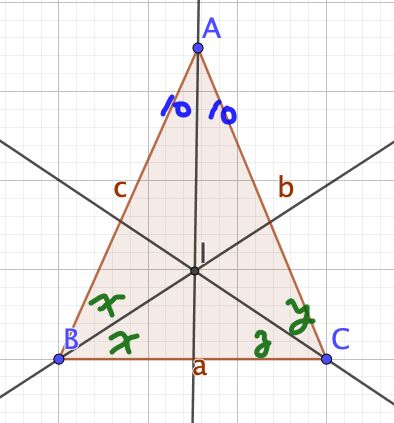 由三角形內心性質得2x+2y+20=180,x+y=80。