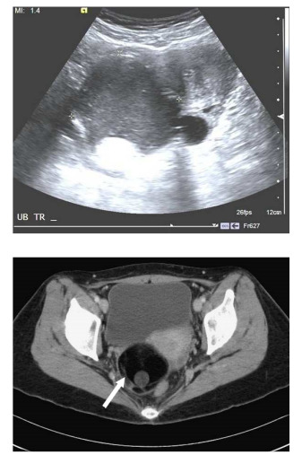 75. 43歲女性病人,健檢時發現CA-199升高,接受腹部影像檢查,上圖為骨盆處橫切超音波,下圖為CT最可能之診斷為何?