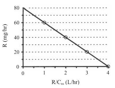 77.已知某藥在體內之排除可用Michaelis-Menten動力學描述,而其給藥速率R(mg/hr)與穩定狀態血中濃度Css(mg/L)間之關係可以下圖方式表示。若將給藥速率維持在30 mg/hr,請 問此時的穩定狀態血中濃度(mg/L)應為何?