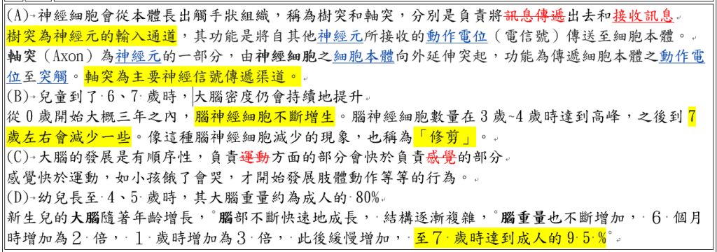 (C)大腦的發展是有順序性,負責運動方面的部分會快於負責感覺的部分