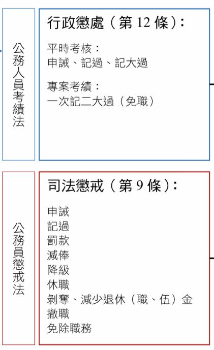 行政責任分 為「懲戒處分」及「懲處處分」等兩種: