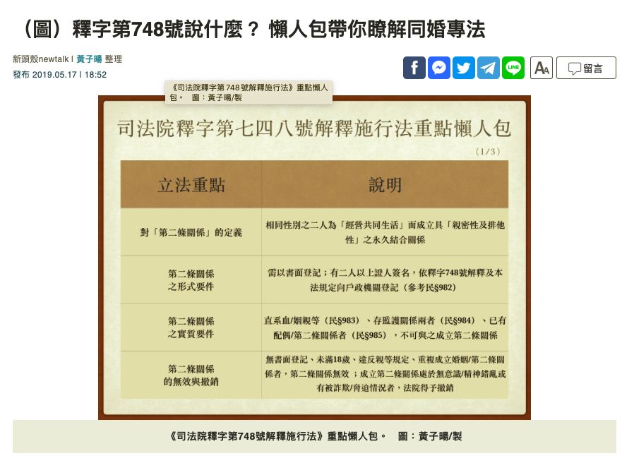 民法第4編親屬第2章婚姻規定,未使相同性別二人,得為經營共同生活之目的,成立具有親密性及排他性之永久結合關係,於此範圍內,與憲法第22條保障人民婚姻自由及第7條保障人民平等權之意旨有違。有關機關應於本解釋公布之日起2年內,依本解釋意旨完成相關法律之修正或制定。至於以何種形式達成婚姻自由之平等保護,屬立法形成之範圍。逾期未完成相關法律之修正或制定者,相同性別二人為成立上開永久結合關係,得依上開婚姻章規定,持二人以上證人簽名之書面,向戶政機關辦理結婚登記。