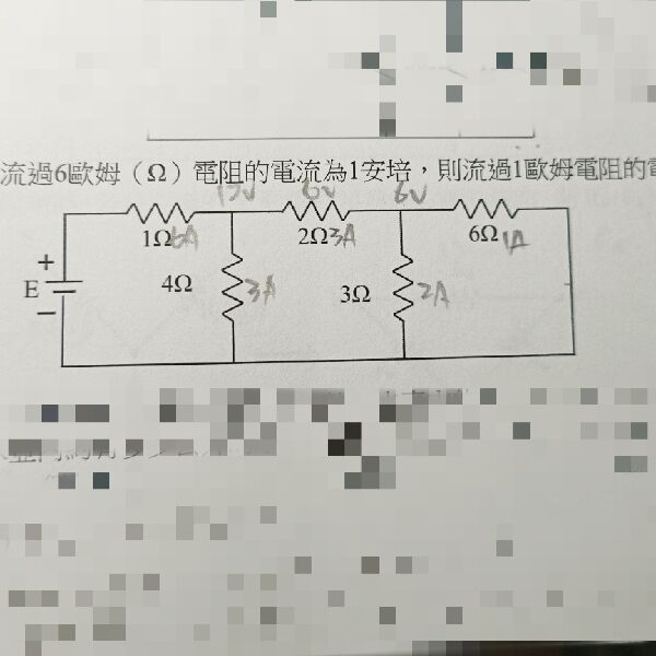 8 如圖所示之電路,若流過6歐姆(Ω)電阻的電流為1安培,則流過1歐姆電阻的電流為何?
