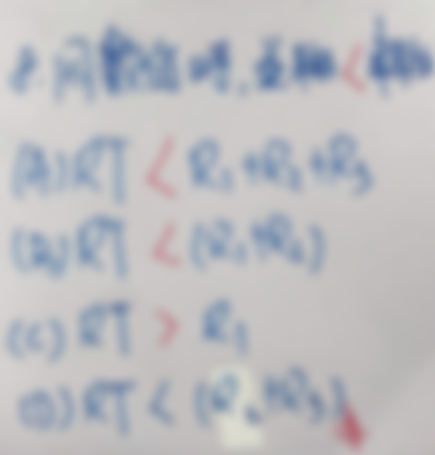 8 有三個電阻器電阻值,分別為 R1、R2、R3,今接線組裝如圖所示,若總電阻為 RT,則下列何情況為 正確?