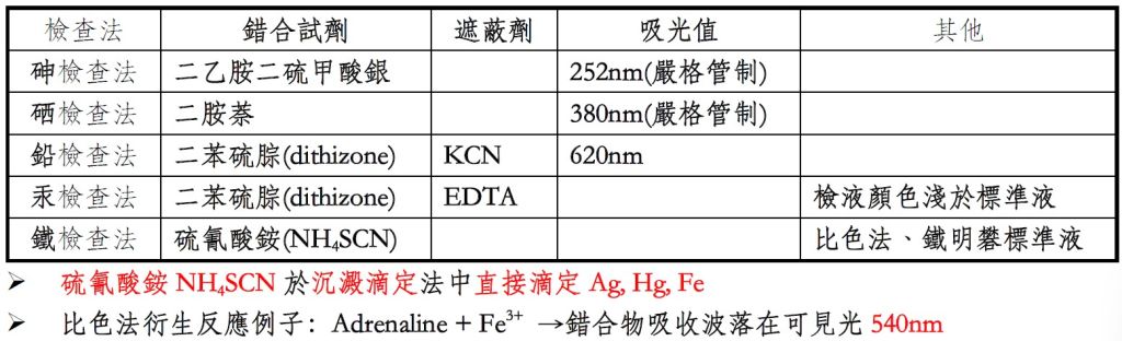 鉛檢查法:二苯硫腙 砷檢查法:二乙胺二硫甲酸銀