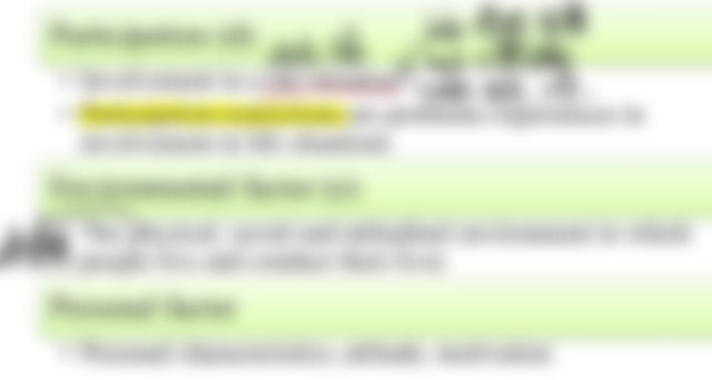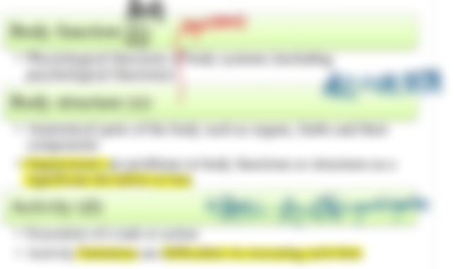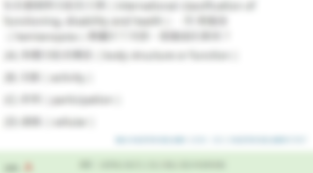 8.何婆婆因腦中風左半邊偏癱,出院後仍覺左側較無力,但已可自行穿脫衣服,且每天使用助行器散步 15 分 鐘。此描述涵蓋國際健康功能與身心障礙分類系統(ICF)那些層面? ①身體構造②身體功能③活動能力④社會參與⑤個人因素⑥環境因素