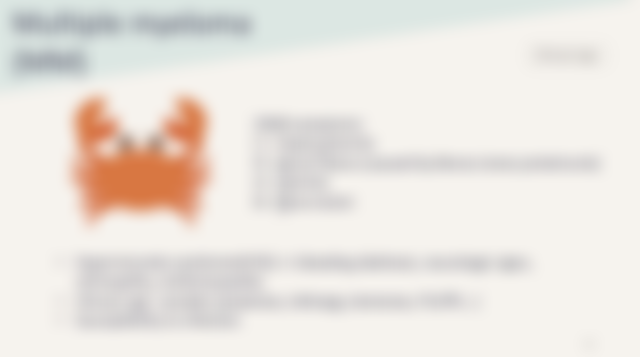 - 常見臨床徵象:高血鈣(hypercalcemia)、蛋白尿、骨痛、貧血