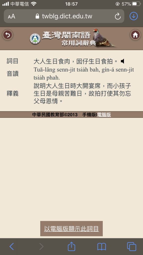 詞目 大人生日食肉,囡仔生日食拍。 音...