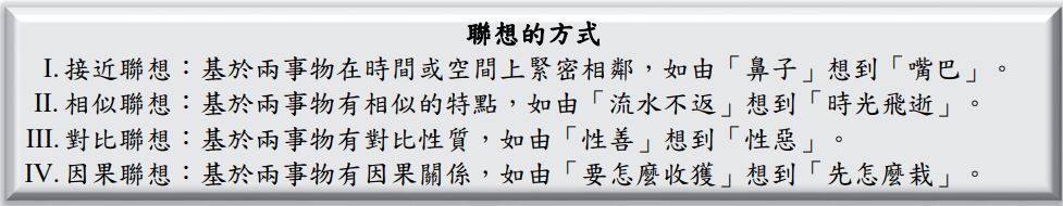 8. 〈庖丁解牛〉的文惠君,因庖丁闡述「游刃有餘」而「得養生焉」;〈種樹郭橐駝傳〉的問者,因郭橐駝闡述「順木之天」而「得養人術」。依據下框,文惠君、問者因聽聞之所得,屬於何種聯想方式?