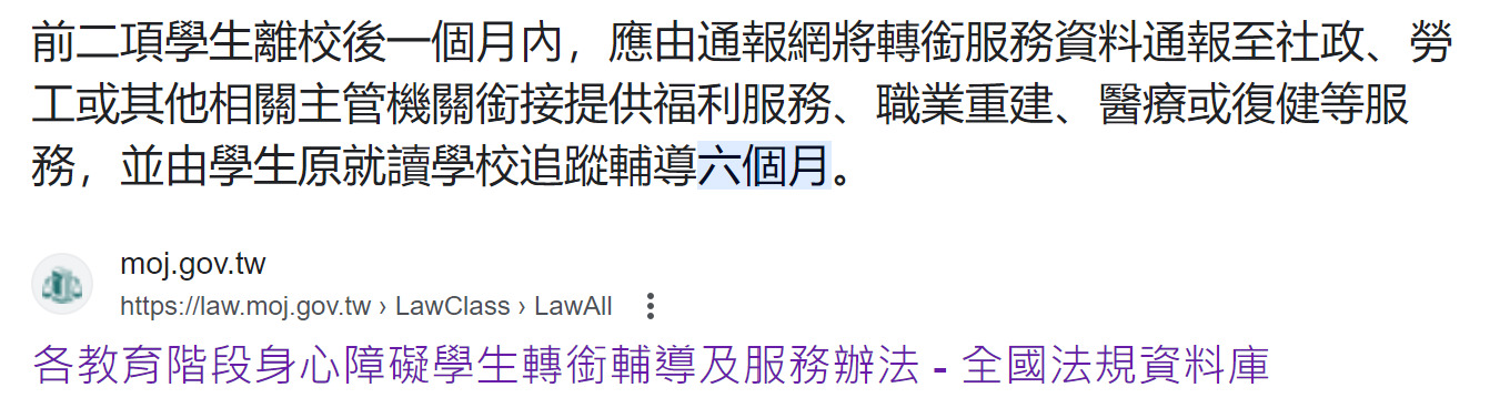 8. 依特殊教育相關法規,身心障礙學生實施轉銜服務之追蹤輔導期為多久時間?