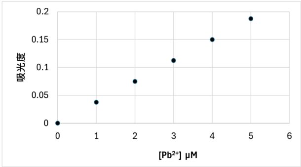 8. 欲分析25.0mL廢水樣品中之Pb²⁺離子濃度,首先將此溶液蒸發至乾,再用2.0mL的水溶解,並加入2.0mL的緩衝溶液和2.0mL的顯色劑,最後加水稀釋至10.0mL。下圖為Pb²⁺離子和顯色劑結合成的錯離子之吸收度標準檢量線,稀釋後的溶液吸光度為0.13,則原廢水樣品中Pb²⁺離子的濃度約為多少ppm?(原子量:Pb=207)