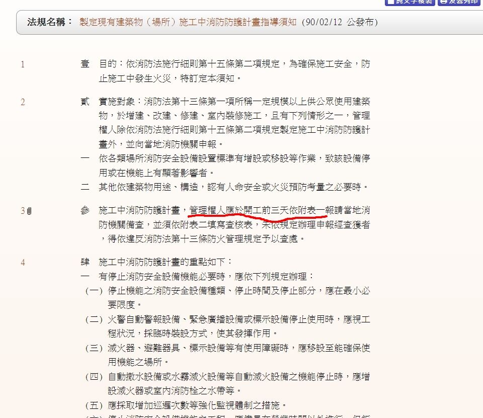火、用電情形。依「製定現有建築物(場所)施工中消防防護計畫指導須知」辦理。管理權人應於開工