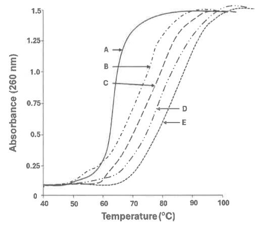 89. The figure below shows the absorbance curve at 260 nm of five 100 bp double-stranded DNA fragments (samples A to E) when subjected to heat. DNA denaturation produces a hyperchromic effect. Which sample has the highest G-C content, according to this graph?