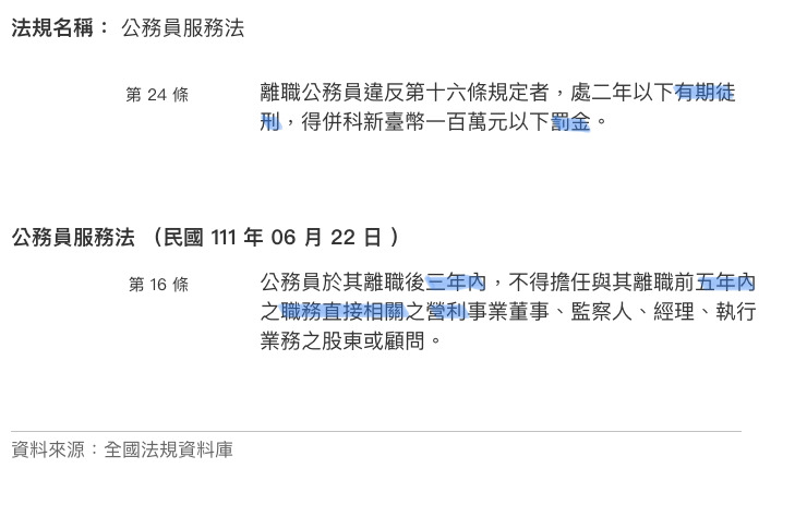 公務員於其離職後三年內,不得擔任與其離職前五年內之職務直接相關之營利事業董事、監察人、經理、執行業務之股東或顧問。