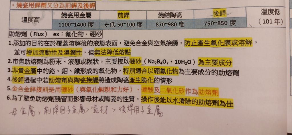 9 銲接瓷融合金屬冠(porcelain fused to metal crown)時,請將下列材料依其熔點高低順序排列:①母