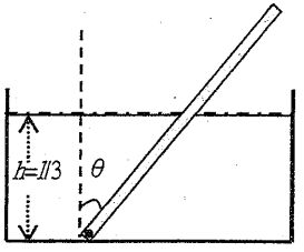 9 A wooden rod of uniform cross section and of length l is hinged at the bottom of a tank which is filled with water to a height h=l/3. If the density of wood is 0.45 g/cm³, find the angle from the vertical at which the rod is in equilibrium.