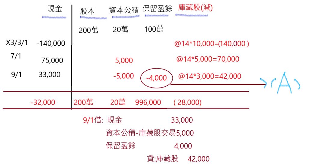及保留盈餘$1,000,000,普通股每股面額$10。X3 年 3 月 1 日以每股$14 買回庫藏股票 10,000 股,同年 7 月 1 日以每股$15 再發行庫藏股票 5,000 股,9 月 1 日以每股$11 再發行庫藏股票 3,000 股,則有關 9 月 1 日之分錄何者正確?