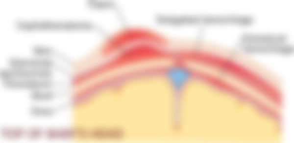 Subgaleal hemorrhage 跨越骨縫,波動水袋、可能失血休克 Caput succedaneum:皮下水腫、輪廓不明。跨越骨縫,摸起來就像...水腫?