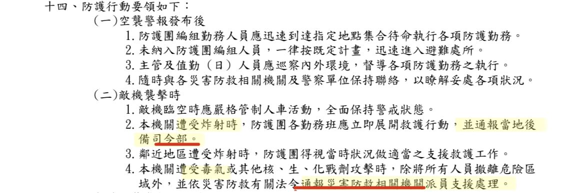 毒氣或其他核、生、化戰劑攻擊時,除將所有人員撤離危險區域外,並通報當地後備司令部派員支援處理