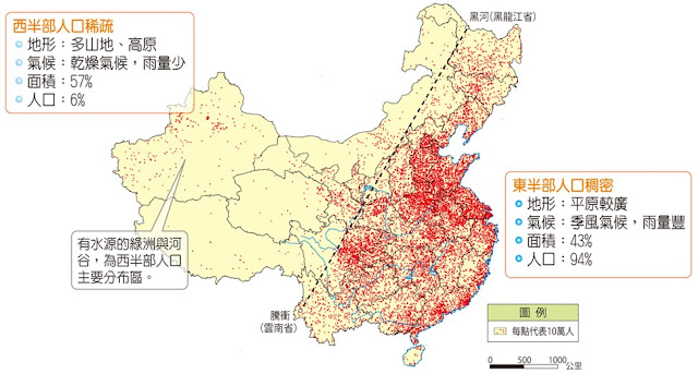 9.為了解中國區域發展的差 異,曉華將中國畫分為甲區 和乙區,並根據2000年的資 料整理出表(二)。由表中各項 數據的比例分配判斷,這二區 的分界最可能為下列何者?