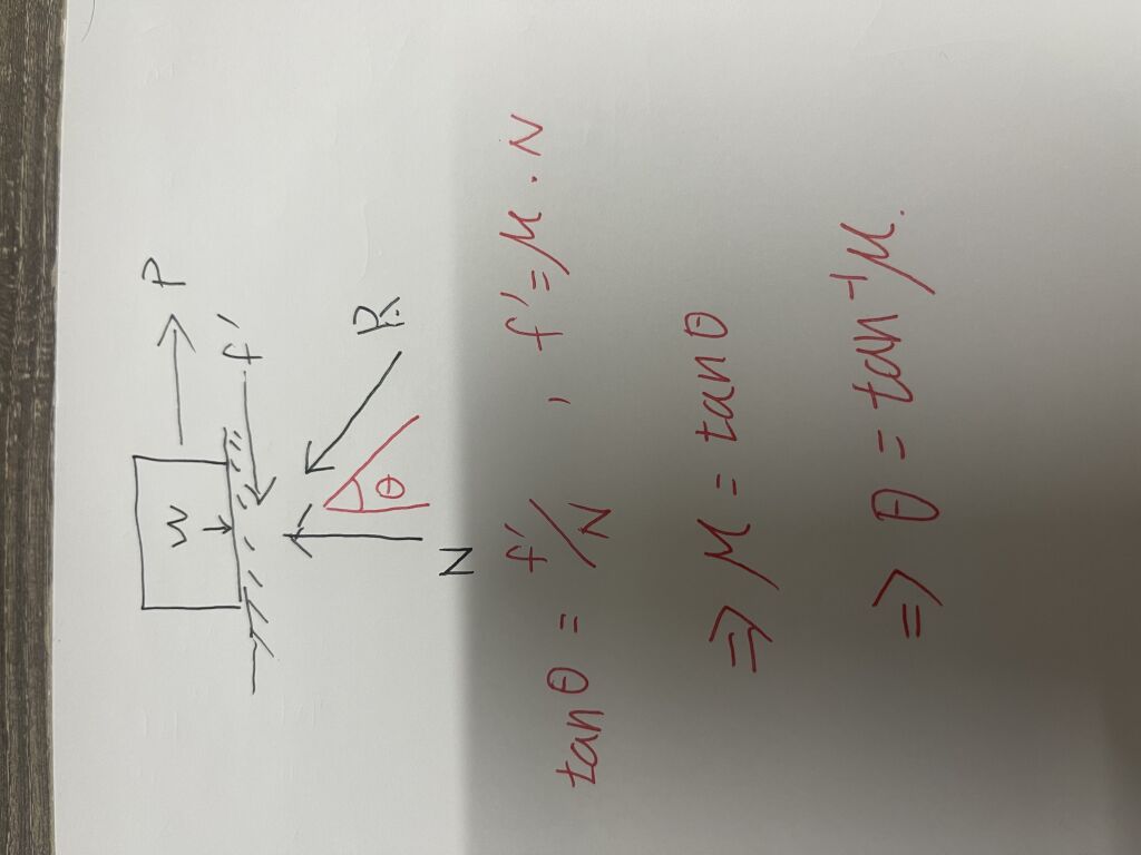9.若有一滑動接觸面的靜摩擦係數為?,則物體置於接觸面上的靜止角(angle of repose)為何?