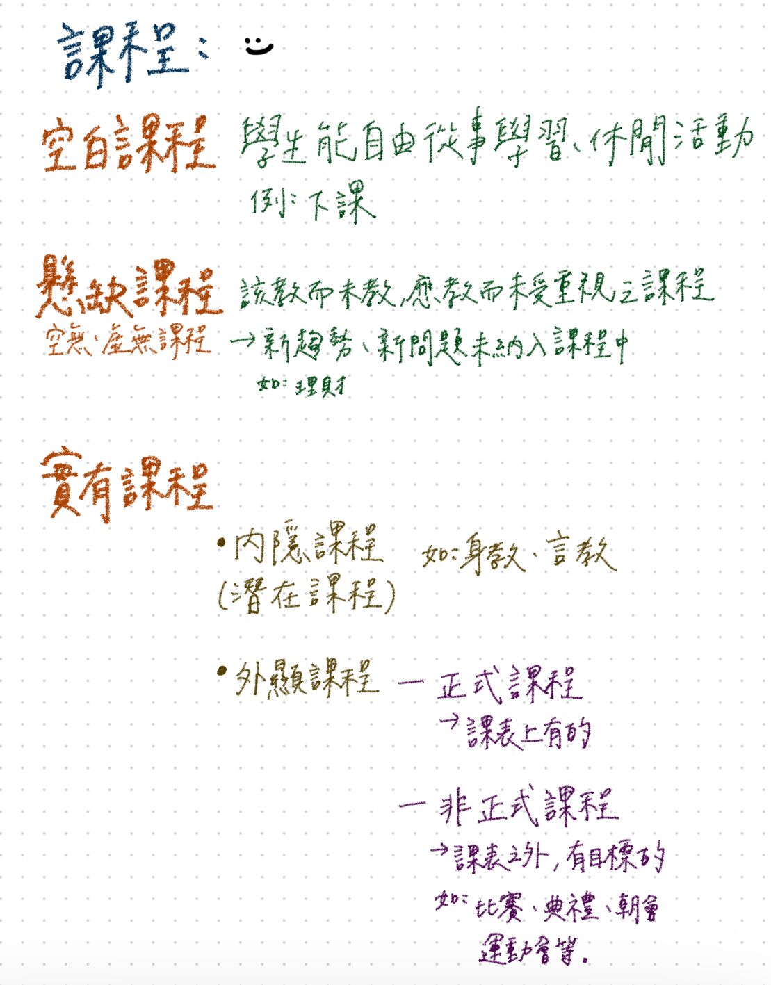 • 非正式課程 (Non-formal Curriculum) 指的是學校在正式上課時間或正式架構之外,透過課餘時間、志工家長、廣播、學習單、學生組成的讀書會等方式所提供的學習經驗和內容。它與正式課程一同構成「外顯課程」。