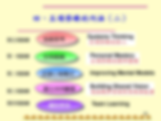 (五)系統思考(Systems Thinking):Senge以系統思考強化其他每一項修練,幫助組織認清變化的型態,並了解如何有效掌握變局,也能運用向下對焦的方式建立基層共識,更能運用向上開展的方式尋找較大的願景,開創新局面。系統思考使自己與組織搭建互通的橋樑,是一種心靈的轉變,讓自己了解與組織共存共榮的使命感。