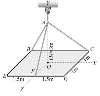 9. 如圖所示,一均勻平板中 600N,三條繩索 AB、AC 與 AF 使此板在一水準位置成一平衡狀態,試求繩索 AB 之張力為