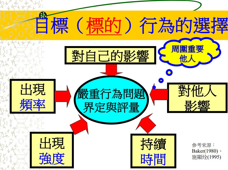 9. 有關行為功能介入方案「標的行為」的界定,下列何者較恰當?
