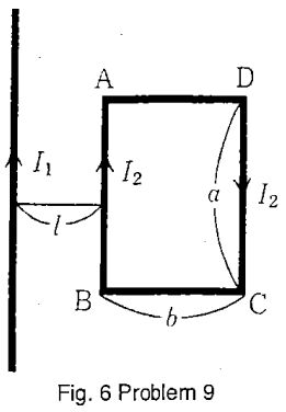 9. A very long wire and a loop are in the same plane and carrying current I₁ and I₂ as shown in Fig. 6. Which is the direction of the force on the loop.
