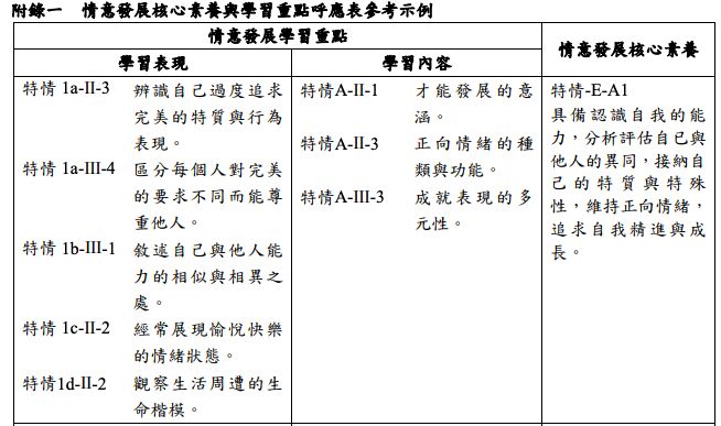 能力成就與期待說明:認知內在能力的差異,欣賞自己優勢及接受弱勢能力;評析自己的學習成就表現與能力相符程度,訂定合宜的成就標準,調整學習策略以減少低成就的負向影響;了解自我與他人的期待,並做適當的抉擇與調整。
