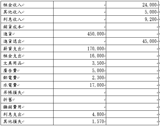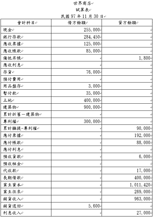 二、 世界商店成立於民國95年7月1日,民國97年12月1日採會計電腦化,該商店的 會計處理情形如下: 1. 商店所用之會計科目及截至97年11月底止各帳戶餘額,如下表所示。 2. 存貨採實地盤存制。 3. 本試題不考慮營業稅。 4. 利息計算方法以一年365日為基礎,並採計尾不計首以計算日期。 5. 商店採歷年制,記帳基礎採先虛後實法,期初未作轉回分錄。 6. 金額計算至元位止,以下四捨五入。 7. 本題報表呈現請依試算表科目(不得增設科目)順序作答 8. 會計人員(製表人):acc