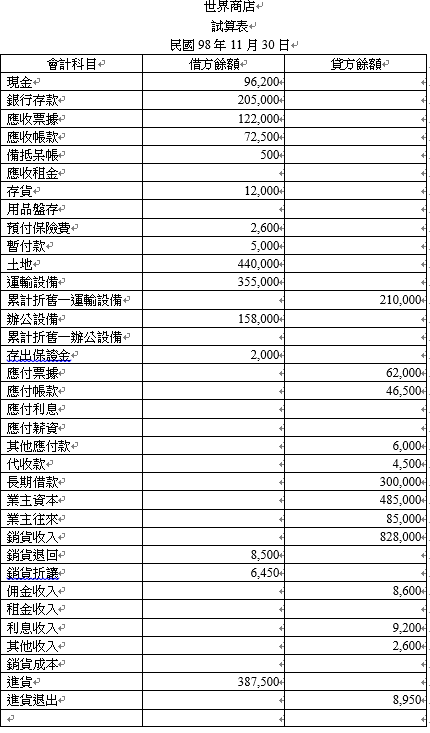 二、世界商店成立於民國95年初,98年12月1日將會計作業電腦化,該商店會計處理如下: 1. 截至98年11月底世界商店所採用的會計科目及各帳戶餘額如下表所列。 2. 商店採曆年制,記帳基礎先虛後實,期初未作轉回分錄。 3. 存貨處理採實地盤存制。 4. 本試題不考慮營業稅。 5. 金額計算至元位止,以下四捨五入。 6. 本題報表呈現請依試算表科目(不得增設科目)順序作答。 7. 會計人員(製表人):acc 二、試作世界商店98年12月份交易事項及年底應調整事項應有之分錄。 12月份交易事項 12月03日 現收佣金 $ 2,800。 12月05日 賖購商品一批 $ 12,000。 12月11日 現購文具一批 $ 900。 12月19日 賖銷商品一批 $ 22,000,收到二個月期票據一紙。 12月23日 張心出差回來報支相關費用:車費 $ 1,900,膳雜費 $2,300,餘款以現金繳回(商店已預支 $5,000 以「暫付款」入帳)。 12月28日 11月12日有一筆支出 $ 1,200係「水電費」,但誤記為「郵電費」。 應調整事項 1. 長期借款年利率6%,毎年1月1日、7月1日支付前半年利息。 2. 運輸設備係95年初購買,採平均法提列折舊。 3. 辦公設備係本年初購入,預計使用5年,殘值 $ 8,000,採平均法提列折舊。 4. 用品盤存尚餘 $ 1,200。 5. 帳上預付保險費係97年3月初投保,期間3年共支付 $ 3,600。 6. 期末盤點現金發現偽鈔 $ 1,000。 7. 依稅法規定上限提列呆帳。 8. 12月份租金 $ 4,800應收未收。 9. 存貨期末盤點餘 $ 6,800(採銷貨成本法,限一分錄)。 10. 12月份薪資 $ 36,000,將於明年初發放。