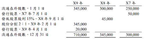 三、丙公司 X7、X8 及 X9 年度之淨利分別為$750,000、$800,000 及$820,000。最近三 年度普通股流通在外股數變動情形如下: