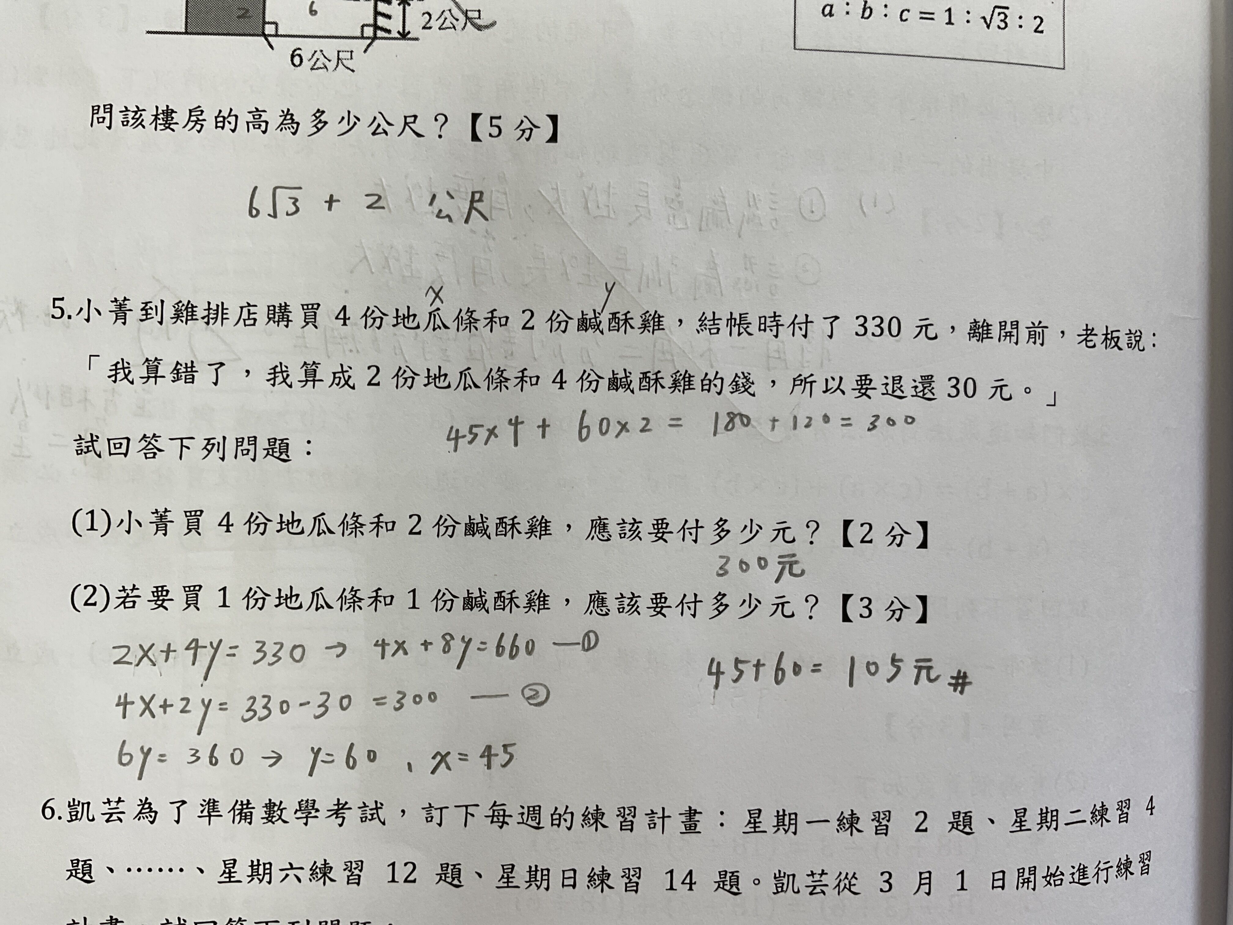 5.小菁到雞排店購買 4 份地瓜條和 2 份鹹酥雞,結帳時付了 330 元,離開前,老板說: 「我算錯了,我算成 2 份地瓜條和 4 份鹹酥雞的錢,所以要退還 30 元。」 試回答下列問題: