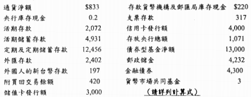 3.請依據下列全體貨幣機構及郵匯局的資料計算:(40分)(單位:新台幣十 億元)