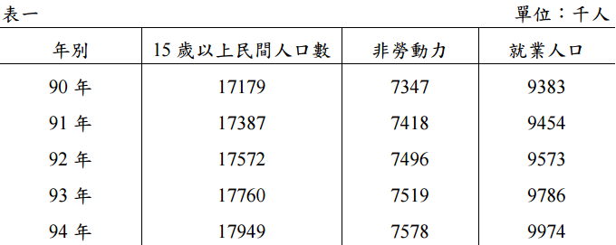 勞動參與率% 90年=57.23% 91年=57.34% 92年=57.34% 93年=57.66% 94年=57.78%