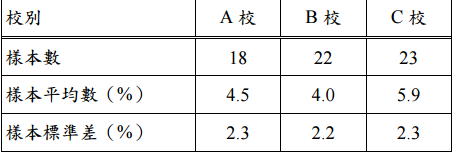 二、以變異數分析法評估 3 個國中學校學生之糖化血色素的差異性。各學校被隨機取樣 的學生樣本數、平均值與標準差之資料如下表所示,請回答下列問題: (F