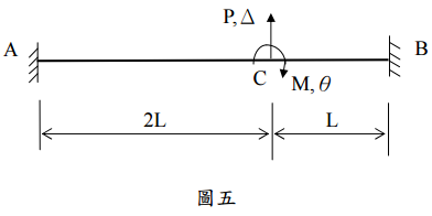 五、下圖五梁 A、B 兩端固定,EI 值均勻,不計梁之軸向變形,試以矩陣法: