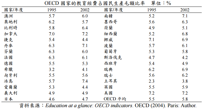 二、近年來大數據分析已成為科學化的國際比較教育研究取向之一。有一位國際比較教 育研究者要分析各國教育投資,蒐集 1995 年與 2002 年 OECD 國家的教育經費占國 民生產毛額比率資料如下表。請回答下列問題: