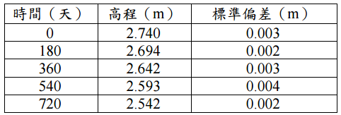 ⑴試以最小二乘法求該水準點之高程線性變化速度(以公分/年表達,一年定為 365 天)。 (10 分)