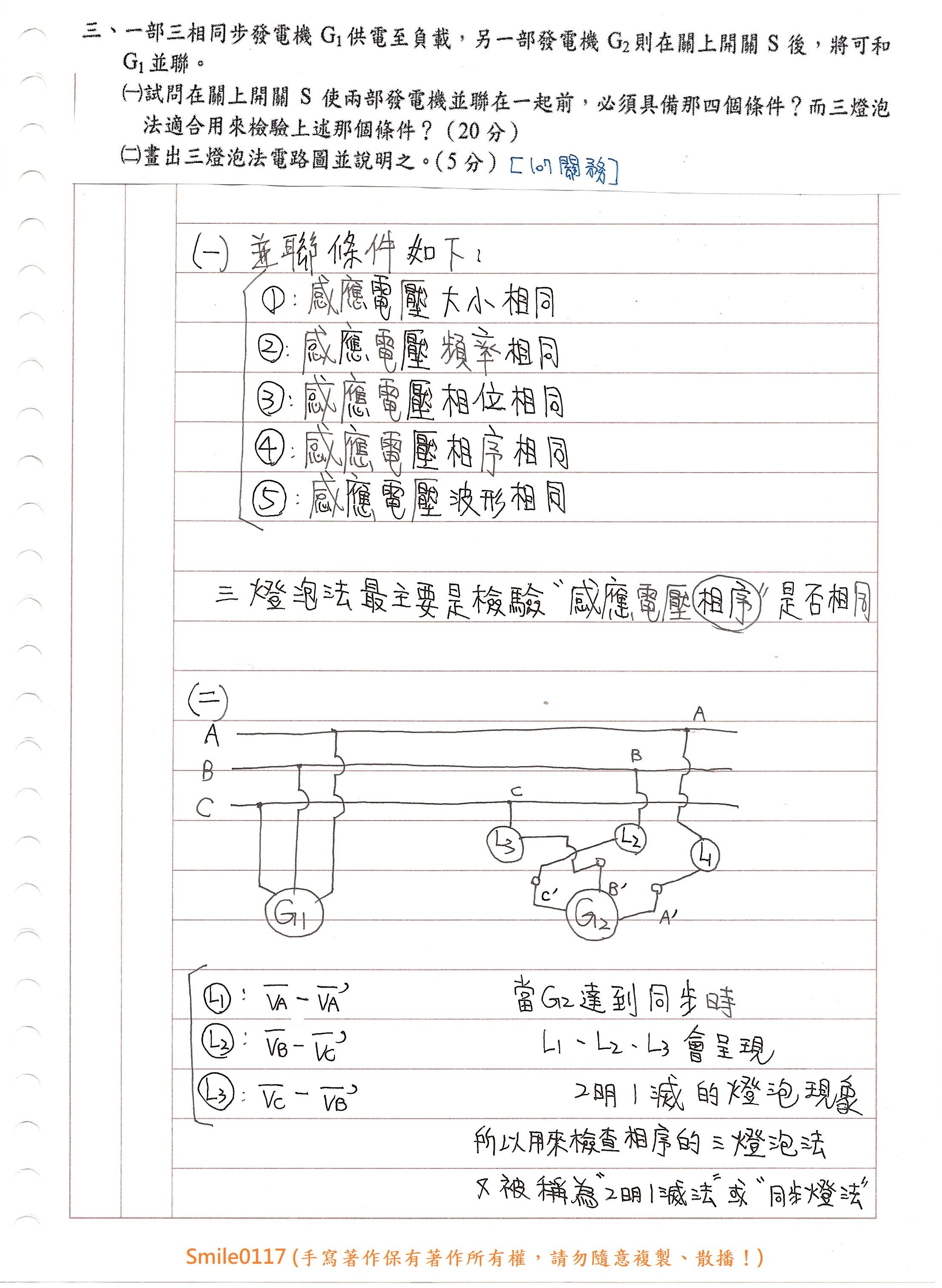 ⑴試問在關上開關 S 使兩部發電機並聯在一起前,必須具備那四個條件?而三燈泡 法適合用來檢驗上述那個條件?(20 分)