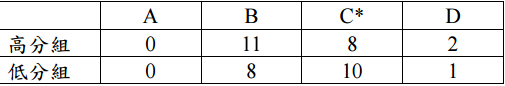 (2)D值介於-1.00到+1.00之間,D值愈大,表示鑑別度愈大;D值愈小,表示鑑別度愈小;D值為0,表示沒有鑑別度,可能是因為試題太容易或太艱難,使得所有人均答對或均答錯,或是題目不清;若D值為負的,表示低分組學生答對百分比高於高分組,具有反向作用,該試題應淘汰。其原因可能是因為能力低的學生胡亂猜測,結果碰巧猜對;能力高的學生看不懂題目、會錯意、粗心大意。
