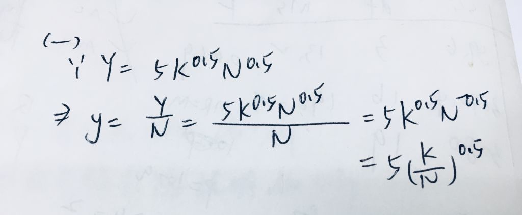 y=Y/N=5K^0.5N^0.5/N=5(K/N)^0.5=5k^0.5