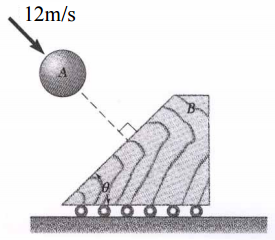 二、如下圖所示,A 球之質量為 3kg,以 12m/s 之速度垂直碰撞滑塊 B 之斜面,滑塊 B 起始為靜止狀態,其質量為 9kg、頃角θ = 40°。已知 A 球與滑塊 B 碰撞之復原係數 (coefficient of restitution)e = 0.5,當 A 球與滑塊 B 碰撞後瞬間,試求:(20 分)