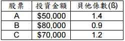 題目二: 王先生投資了三檔股票,投資金額與股票的貝他係數(ß)如下表所示,請回答下列問題: