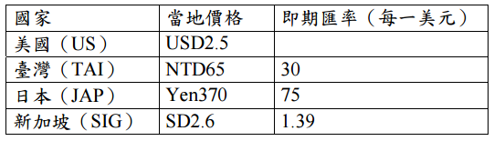 一、下表是 2011 年品質相同的麥香堡在各國的銷售價格,以及美元在各國外匯市場的 即期匯率。