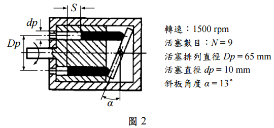三、請計算圖 2 所示航空器用液壓斜板式(swash plate)活塞泵之: